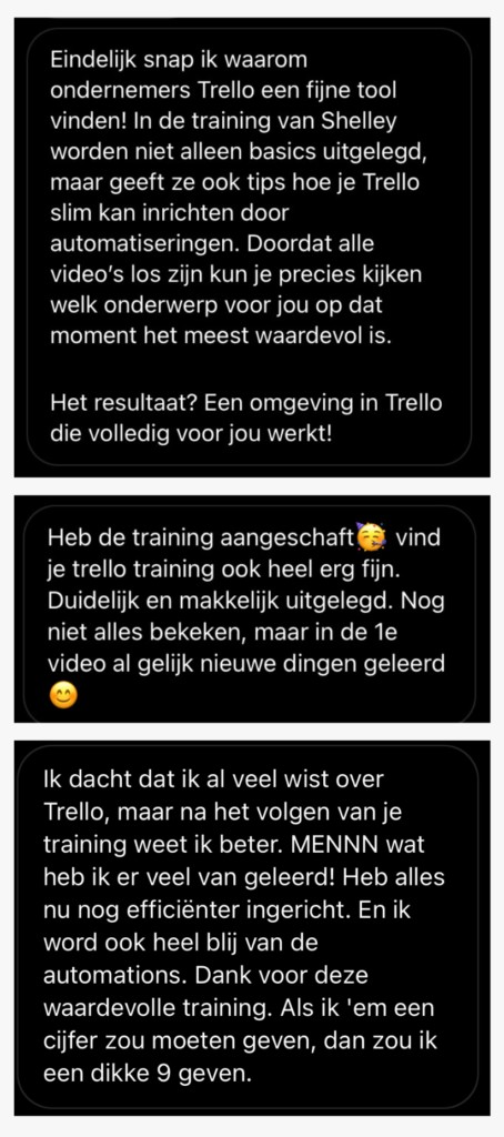 “Ik gebruik Trello voor mijn werk als VA, maar miste overzicht en een gevoel van voldoening door een leeg Trello bord. Daar heeft Shelley mij bij geholpen en ik ben haar zo dankbaar! Mijn Trello is nu geautomatiseerd, gestructureerd en leeg aan het einde van de week. Mijn to do’s komen automatisch elke week op de juiste dag in mijn Trello bord en Shelley heeft mij nog wat trucjes laten zien hoe ik mijn Trello bord nog efficiënter kan inrichten.”