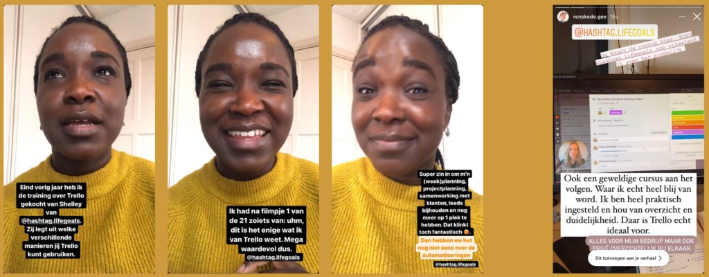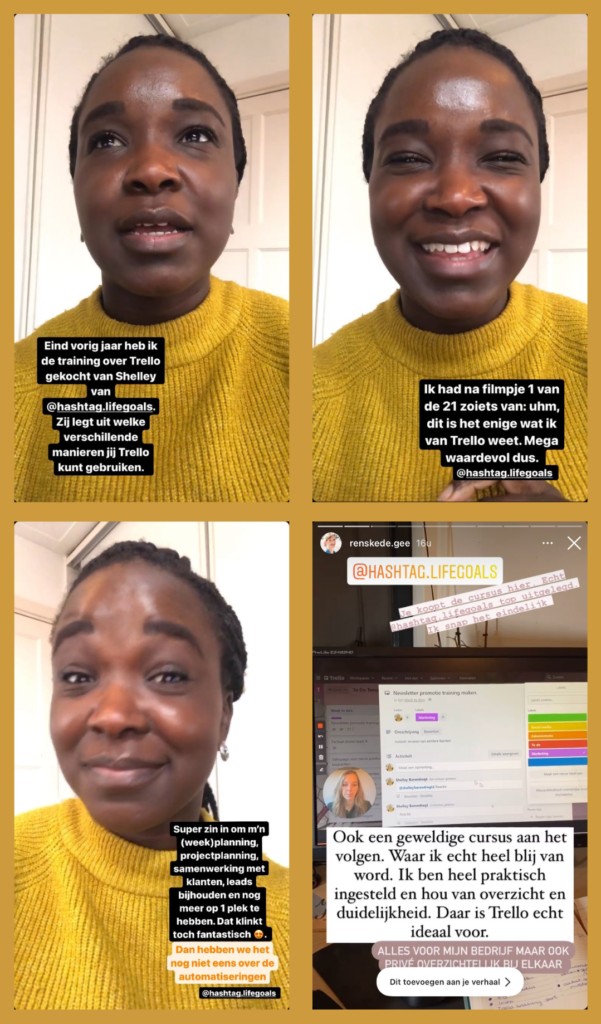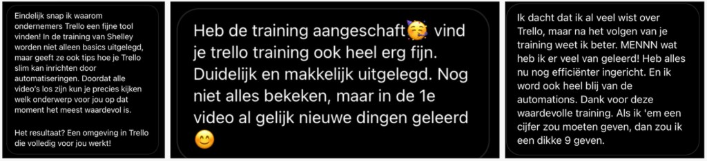 Vooral de lessen hoe samen te werken met klanten en zaken automatiseren via Trello zijn super waardevol. Daarnaast is Shelley als persoon ook een echt leuk mens. Kortom, ik ben oprecht heel blij met alle tips en tricks.