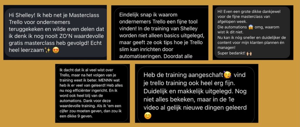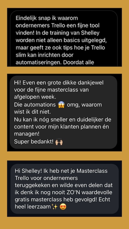 Shelley wekte mijn nieuwsgierigheid en ik besloot de masterclass te volgen. Na deelname was ik direct verkocht en dezelfde dag nog heb ik het volledige programma aangeschaft “Efficiënt Ondernemen met Trello”. Dit heeft me al na een week naar een next level timeplanning gebracht met automatiseringen. Het resultaat is meer rust en minder handmatig werk.