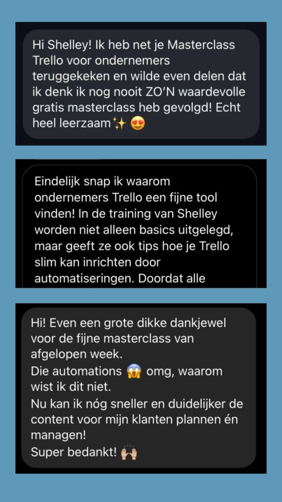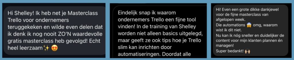 “Vroeger werkte ik graag met ClickUp. Tot ik door Shelley de wondere wereld van Trello ontdekte. Naast dat ik business coach ben, ben ik ook een echte IT nerd en automatiseringsexpert. Ondanks mijn nerdy achtergrond heb ik echt zoveel van deze topper mogen leren! Shelley weet namelijk echt ALLES over Trello. En dan niet alleen de standaard dingen. Ik bedenk altijd hele gekke automatiseringen om tijd te besparen, ook binnen tools. Zelfs voor mijn meest wilde ideeën heeft zij een passende oplossing bedacht. Ze is voor mij een echte Trello Pro!”